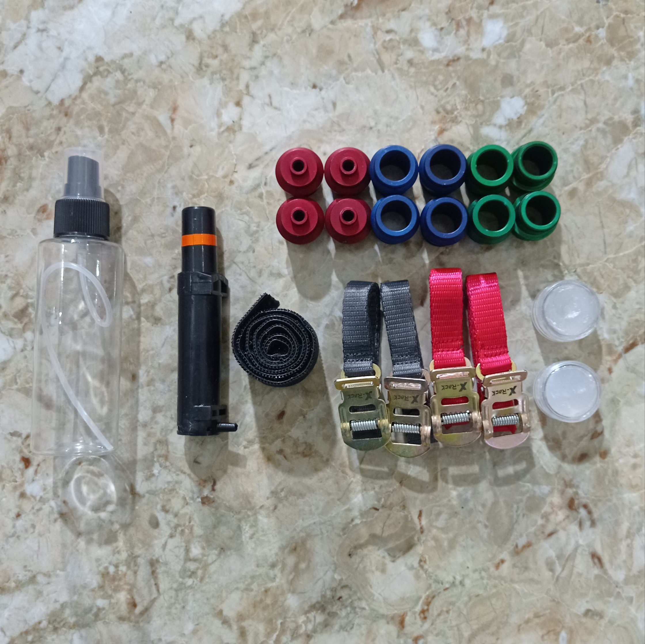 اقلام همراه: گریس مخصوص.اسپری تمیز کننده سطح.انواع اداپتور برای نصب کمک جلو روی باربند.بند کمکی.بند چسبی یدک.پمپ هوای یدک قابلیت نصب تکی یا همزمان دو عدد دوچرخه