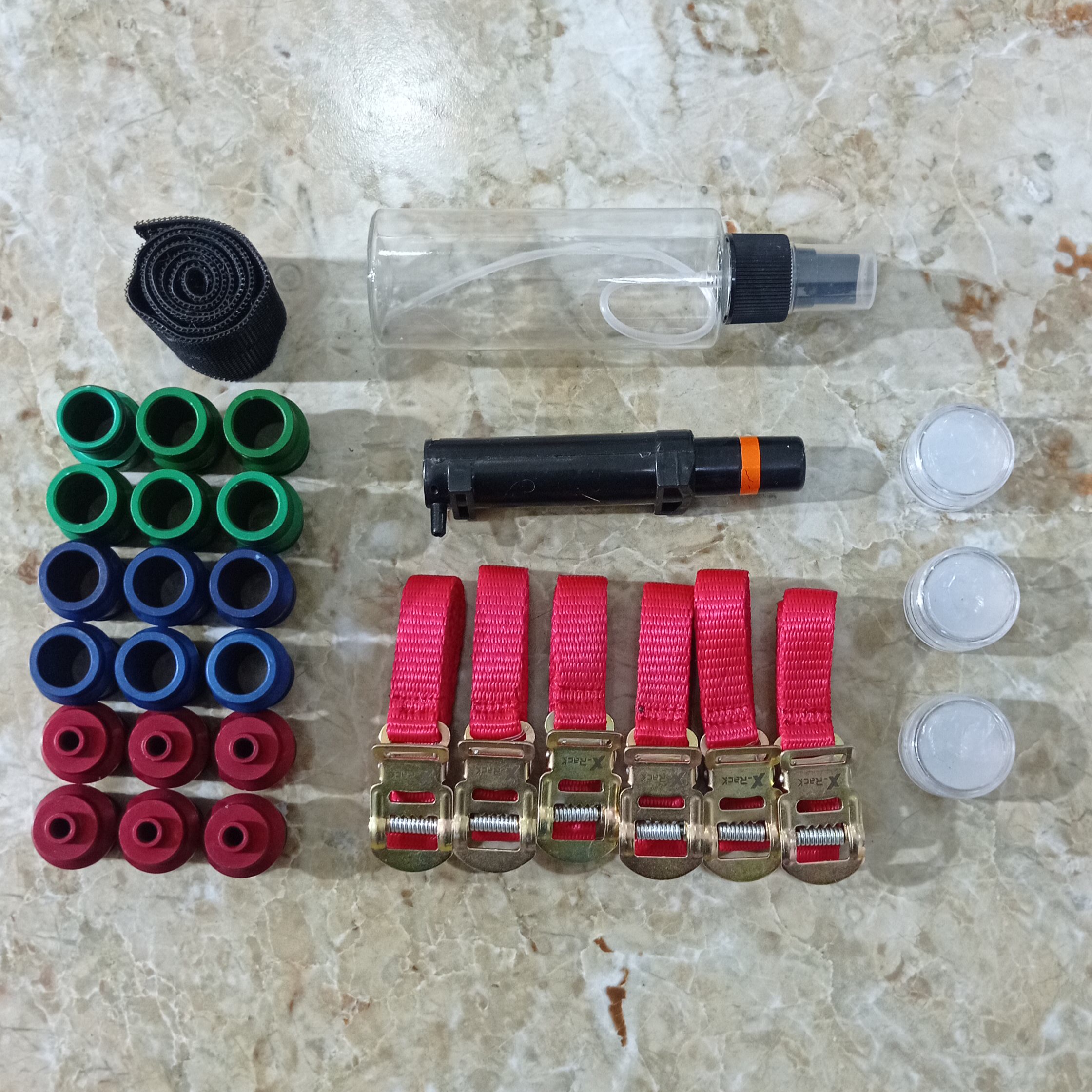 اقلام همراه: گریس مخصوص.اسپری تمیز کننده.اداپتور های مختلف برای نصب دوشاخه جلو.بند اضافه.بند چسبی یدک.پمپ هوای یدک. مناسب برای نصب یک، دو و سه دوچرخه همزمان بسته به نیاز مصرف کننده